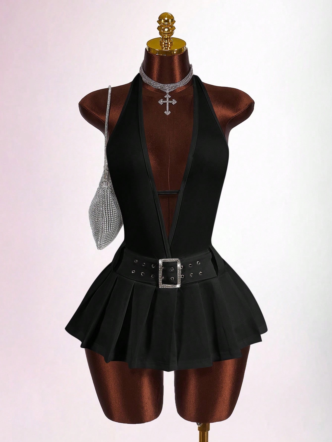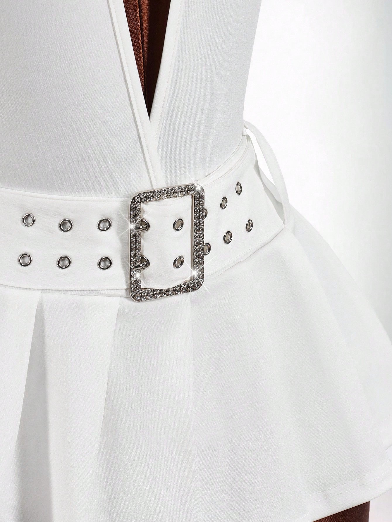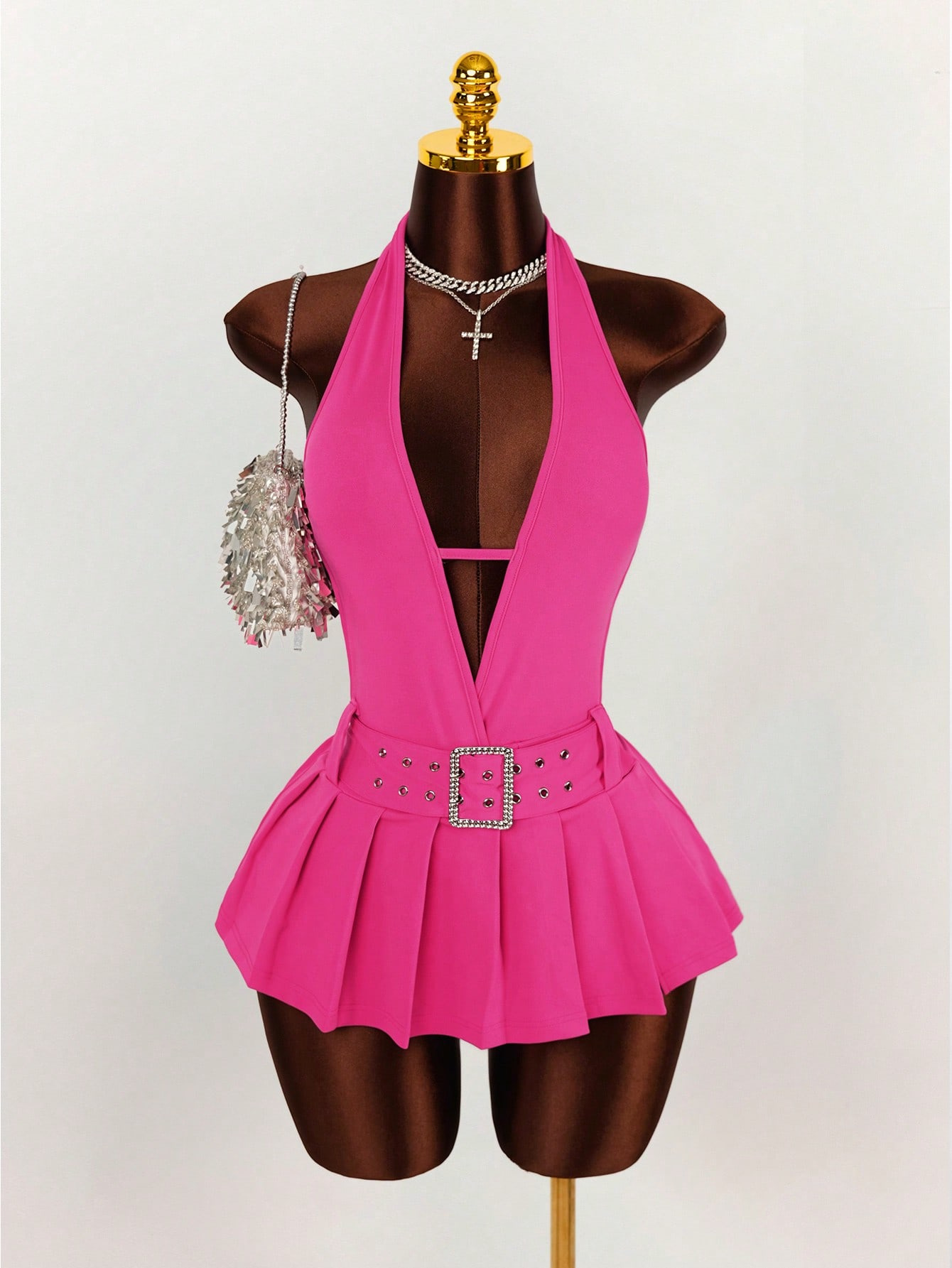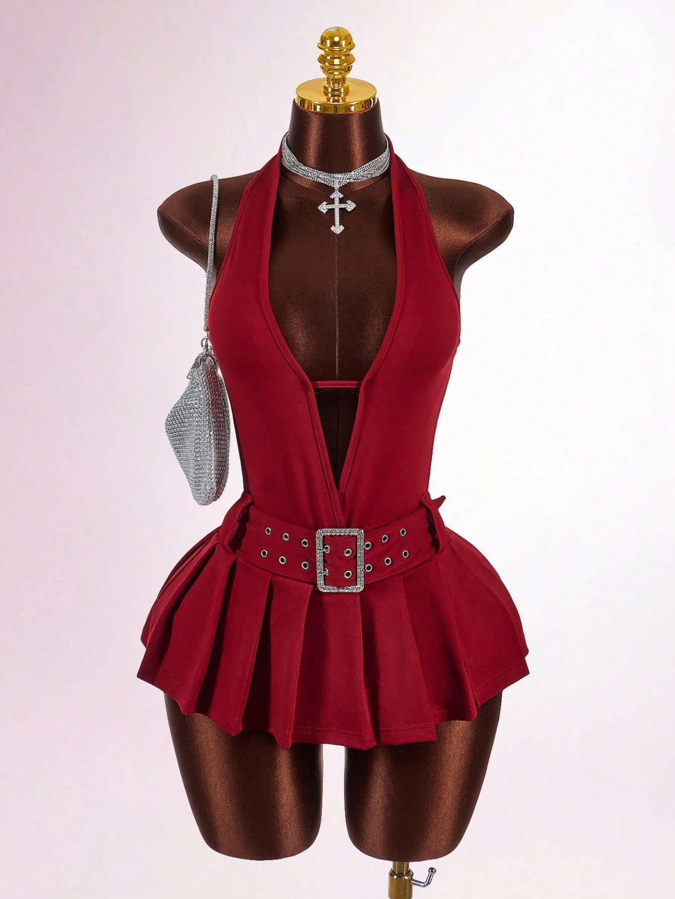 Copy| Product Name | Women's Fashion Solid Color Slim Waist Halter Neck Low Back Deep V Pleated Mini Dress |