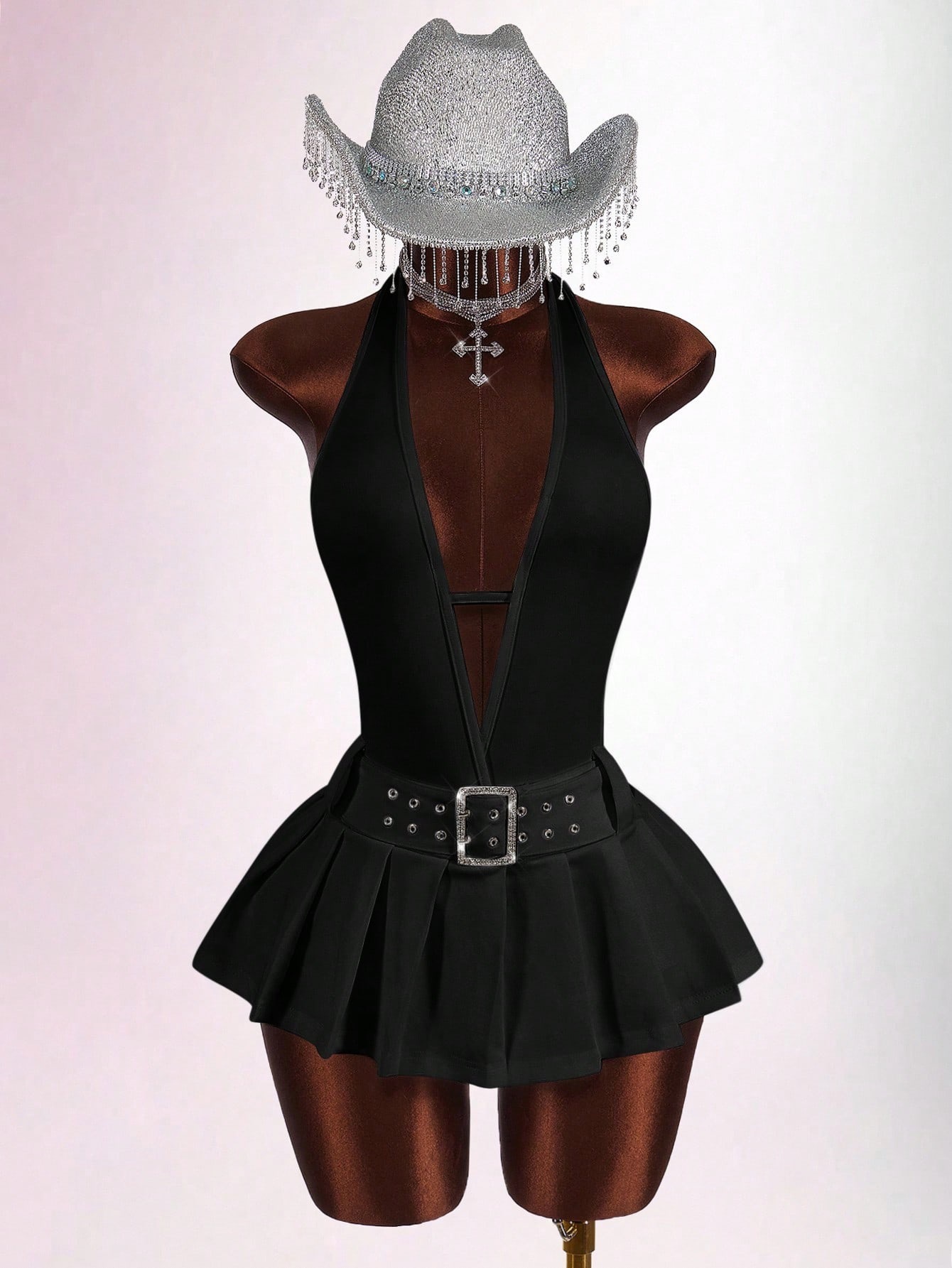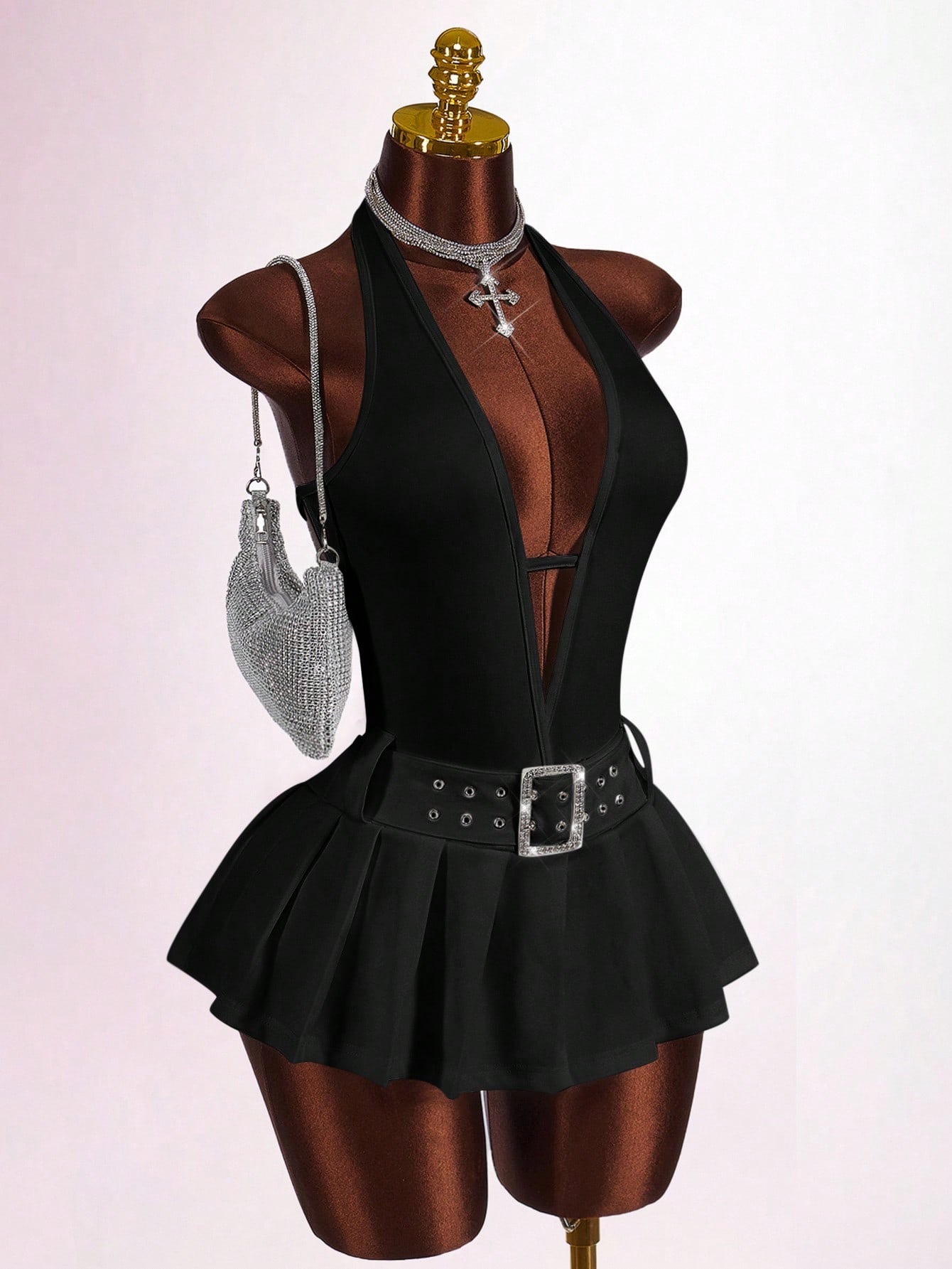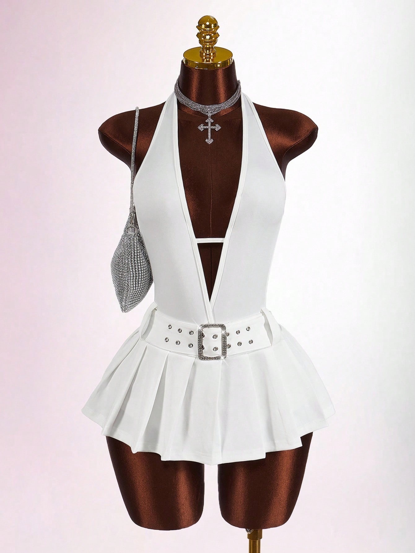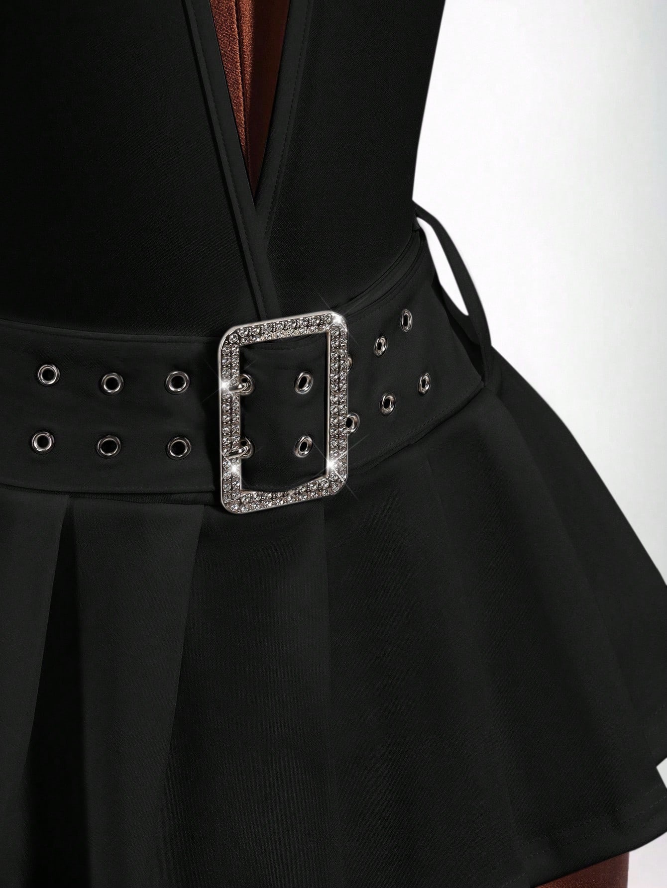 Copy| Product Name | Women's Fashion Solid Color Slim Waist Halter Neck Low Back Deep V Pleated Mini Dress |