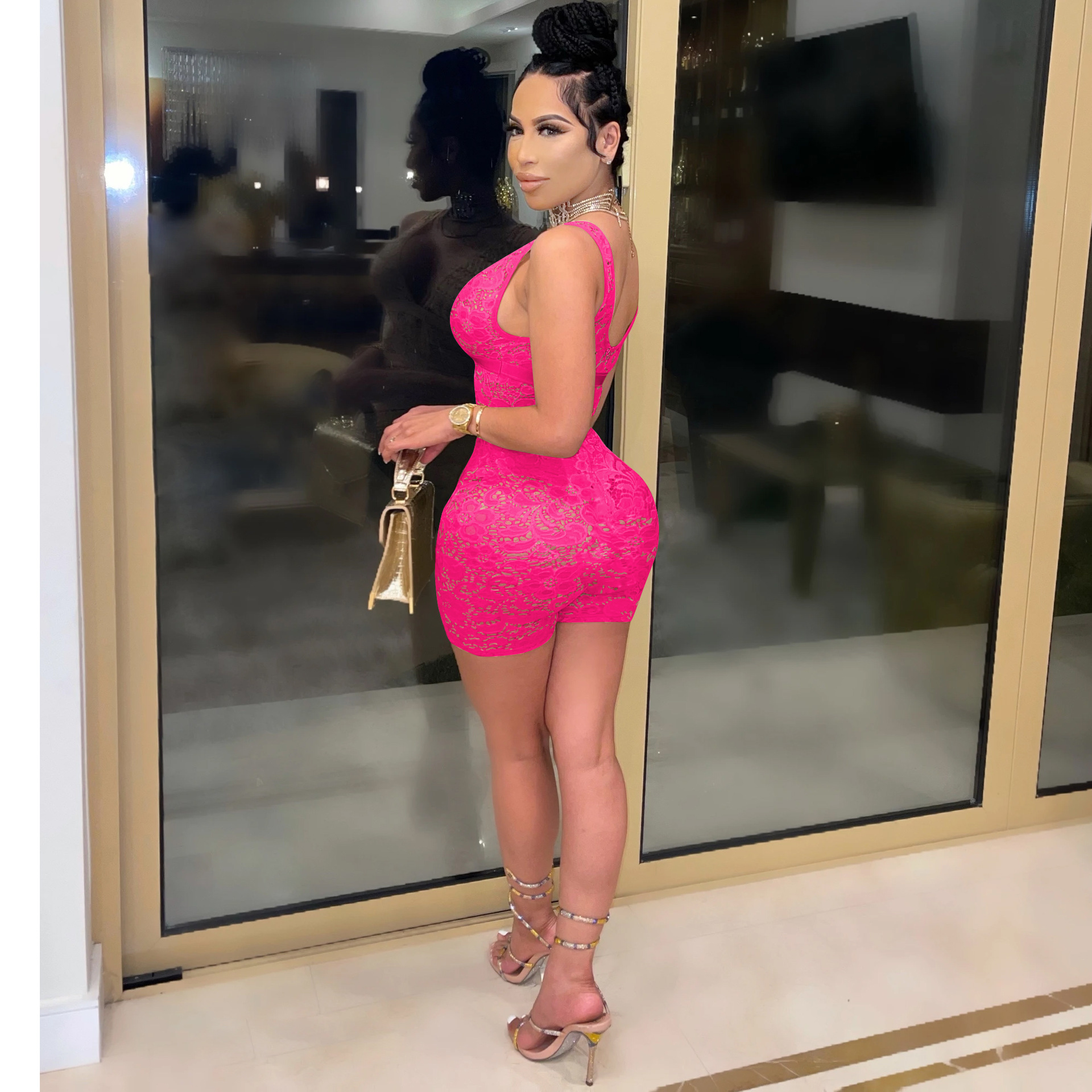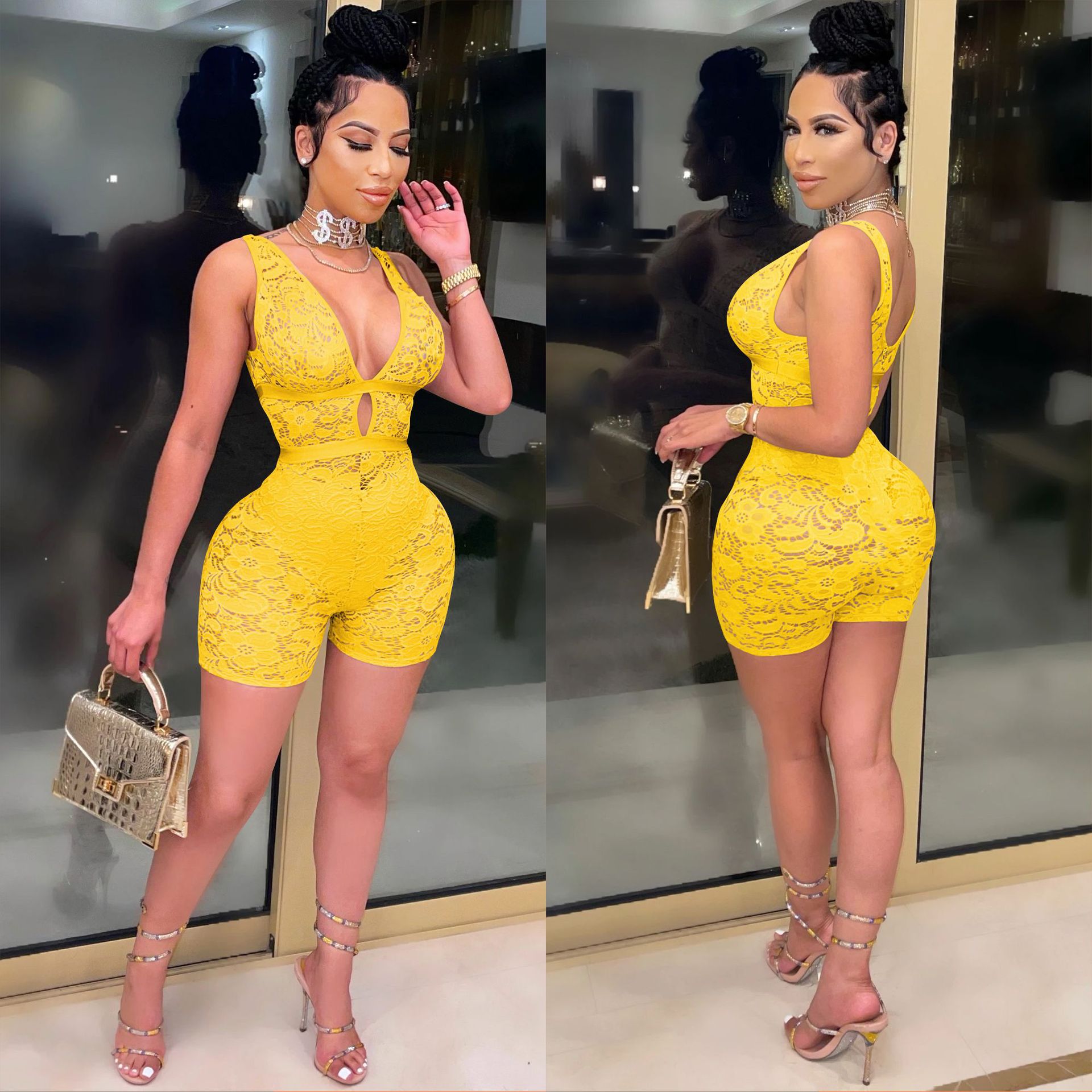 This Women's Fashion Solid Color Tight-Fitting Sleeveless v-Neck Lace See-Through Nightclub Jumpsuit Design Made Of High Quality Polyster And Spandex Material. It Is Stretchy, Durable And Comfortable. It Is The Favorite Item For Summer. Wholesale Sexy Long Sleeve Playsuit Has Long Been a Party Choice. Global Lover Provide a Rich Selection Of Sequin, Beaded, See Through Mesh, Leopard, Floral Lace, Leather, Velvet, Denim, Tight And Fitted Wholesale Jumpsuit On Trend. When You Need More Buy Women’s Playsuits At Whoelsale Price For Resale, Global Lover Wholesale Women Apparel Online Store Is Your Best Choice.
