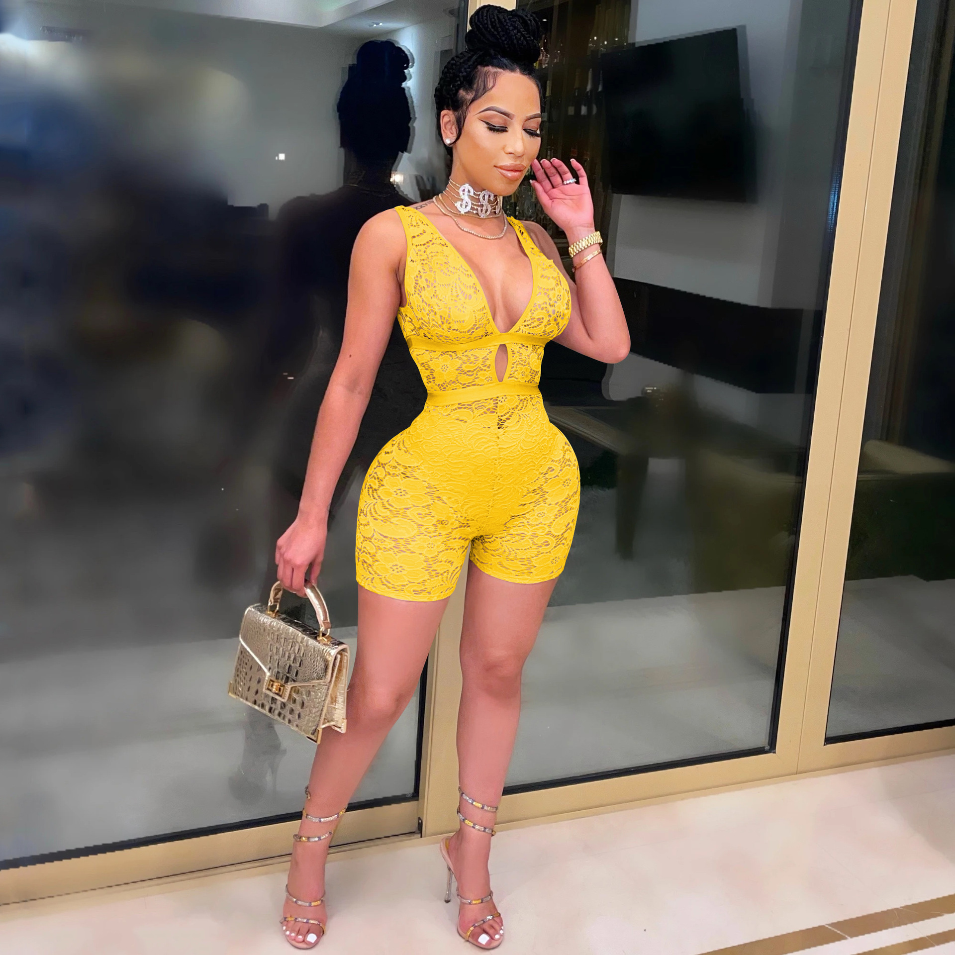 Copy| Product Name | Women's Fashion Solid Color Tight-Fitting Sleeveless V-Neck Lace See-Through Nightclub Jumpsuit |