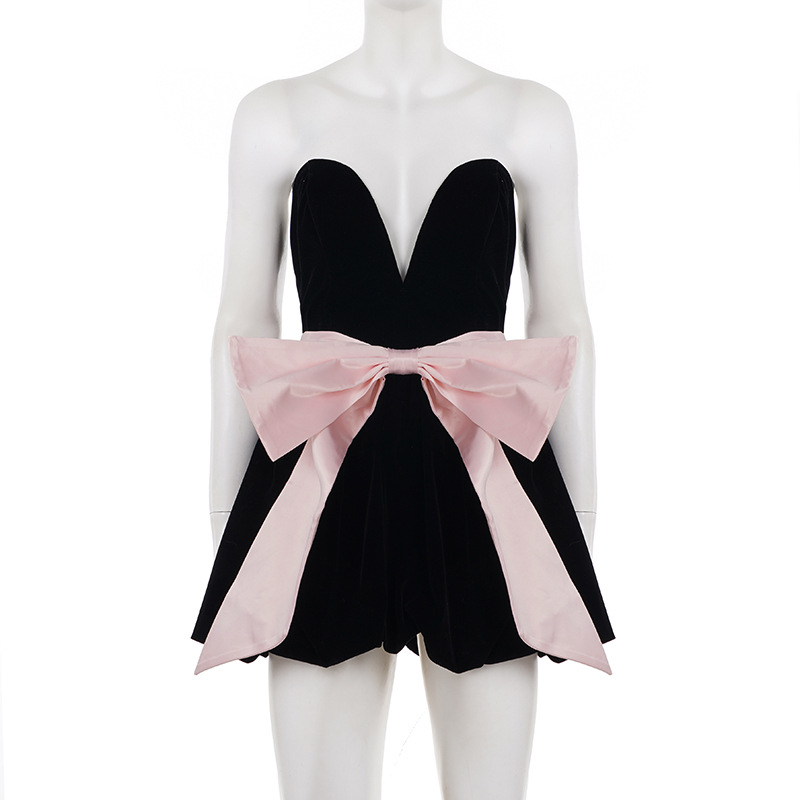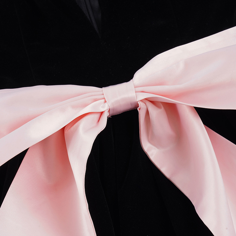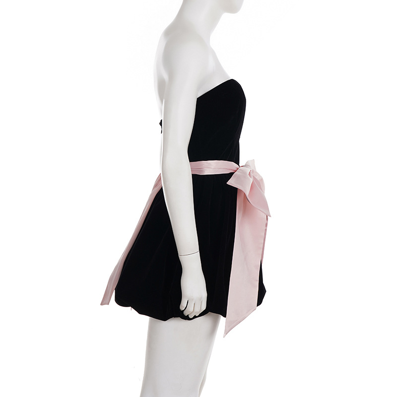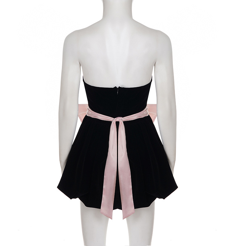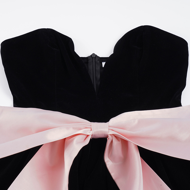 Copy| Product Name | Women's Fashion Strapless Velvet Colorblock Bow Patchwork Slim Waist Puffy Dress |