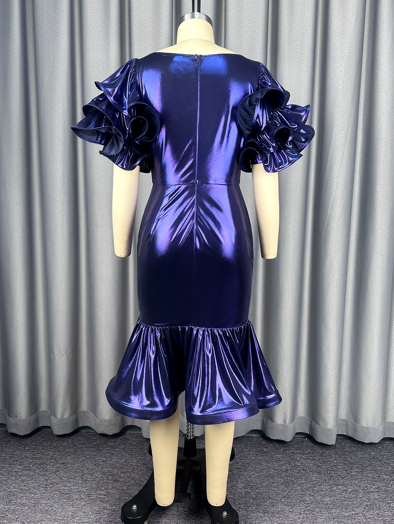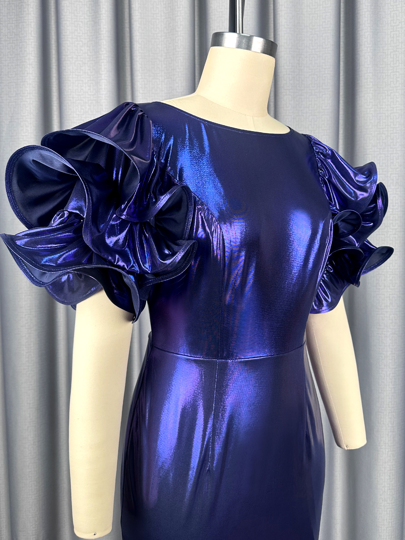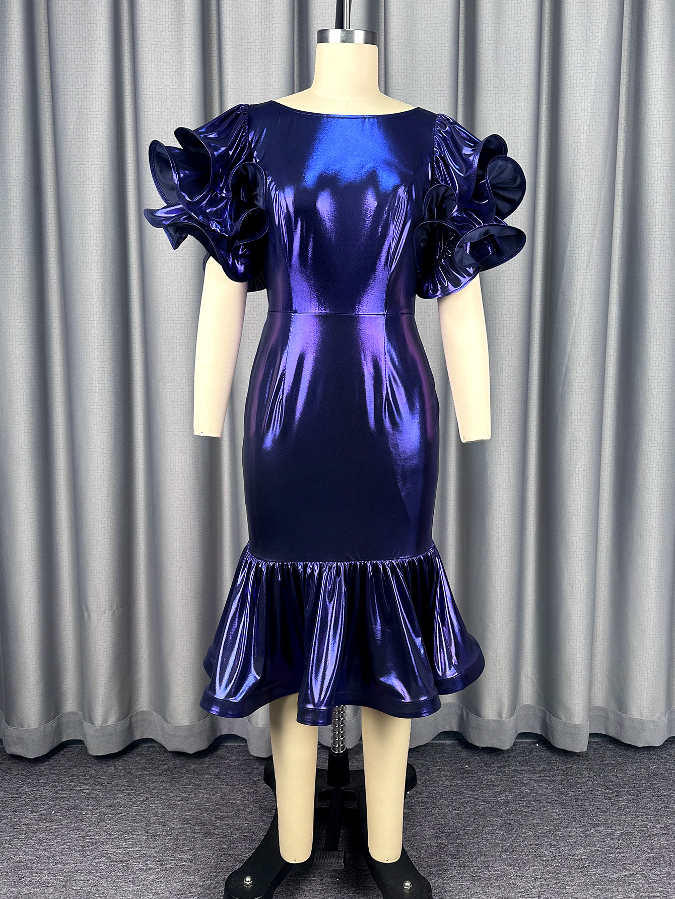 Copy| Product Name | Women's Formal Party Glossy Puff Sleeve Round Neck Slim Waist Ruffle Mermaid Evening Dress |