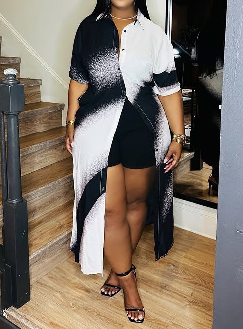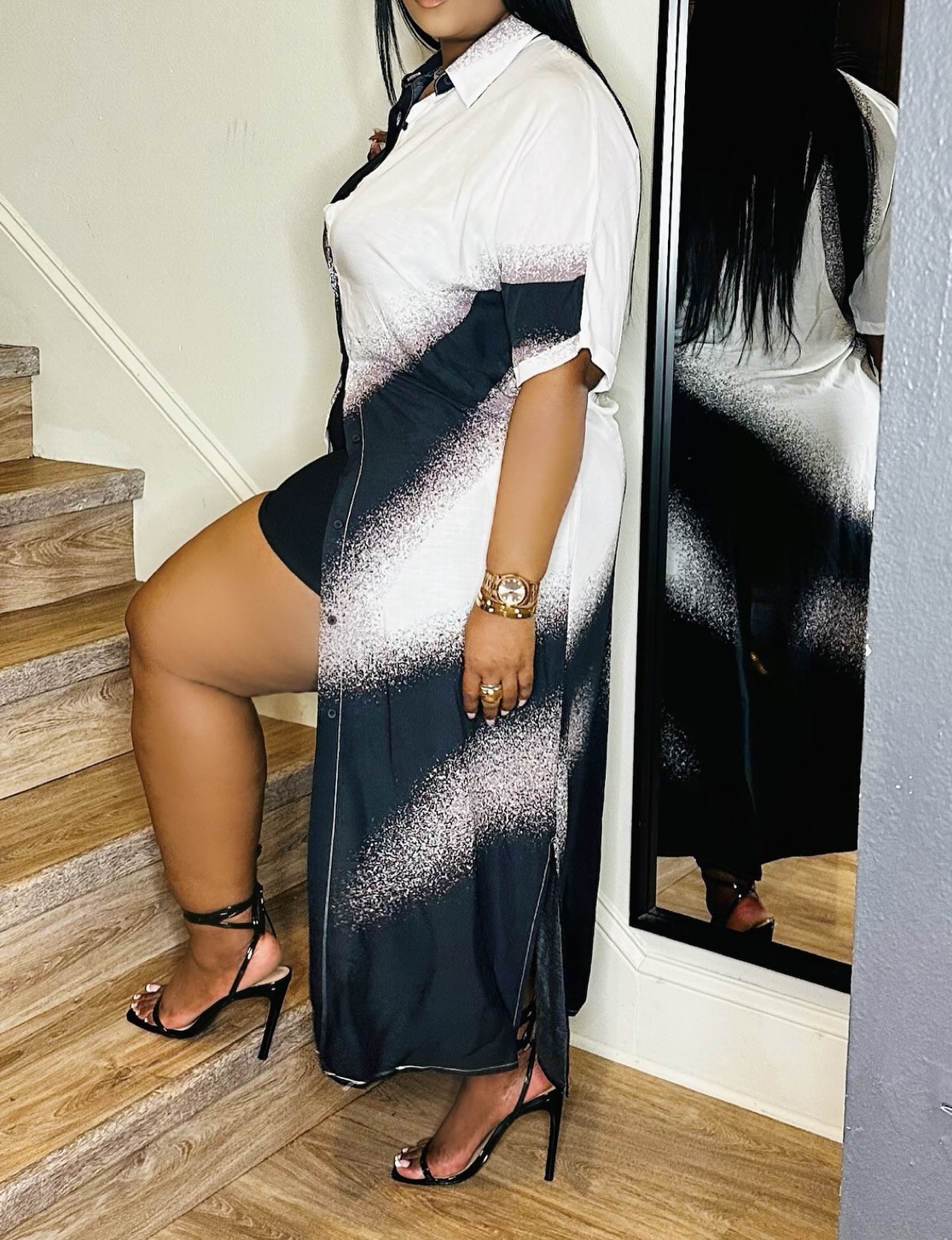 Copy| Product Name | Women's Loose Casual Button-Down Slit Hem Print Shirt Dress |