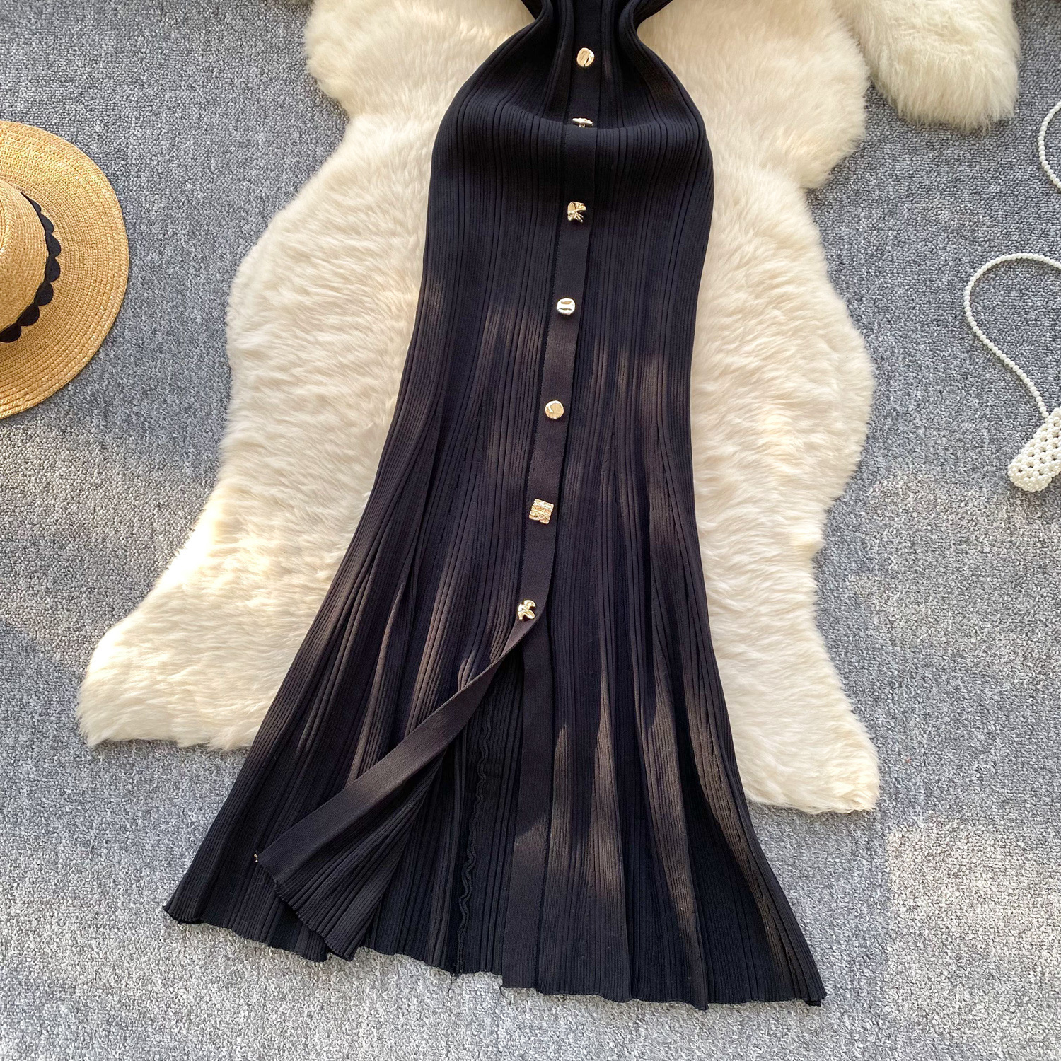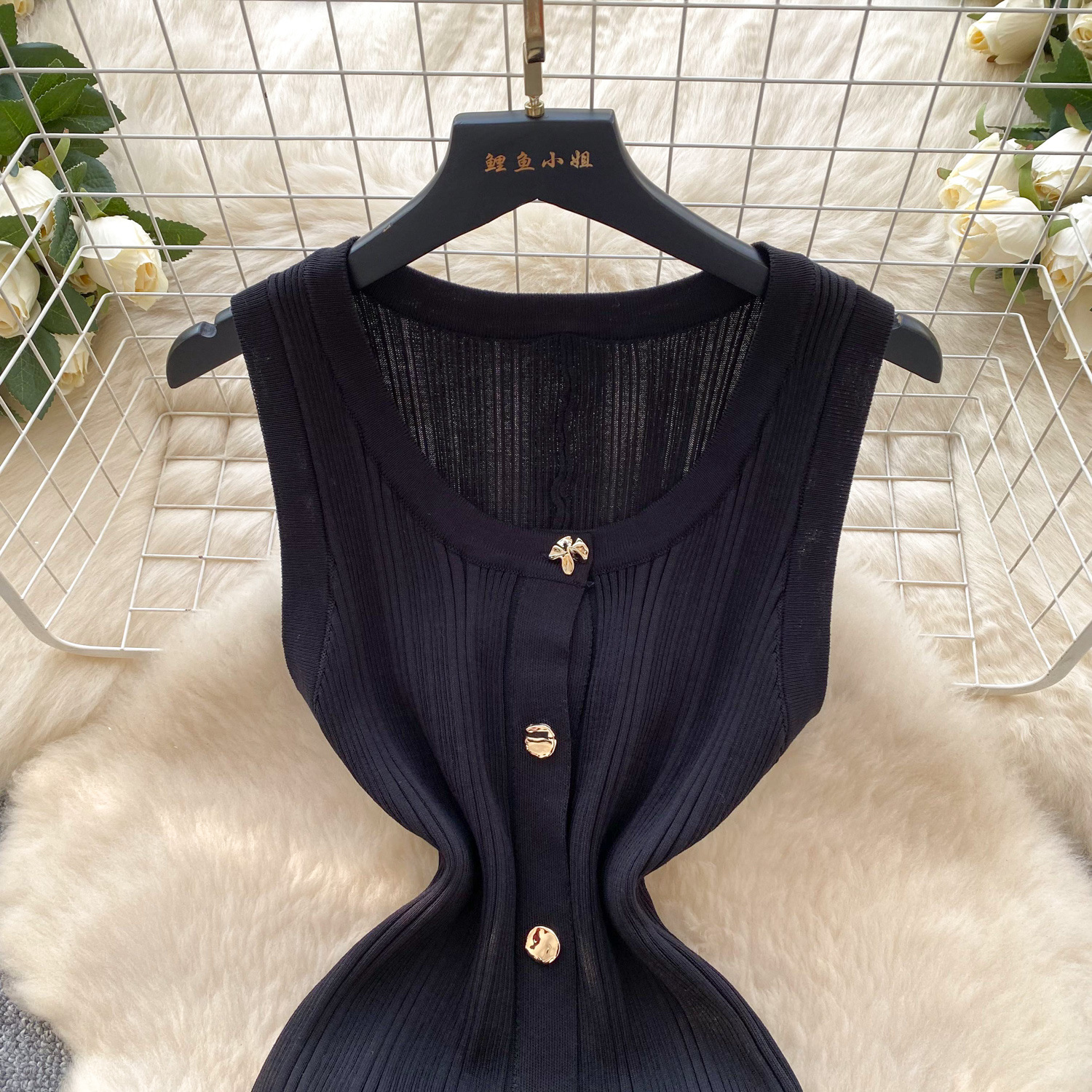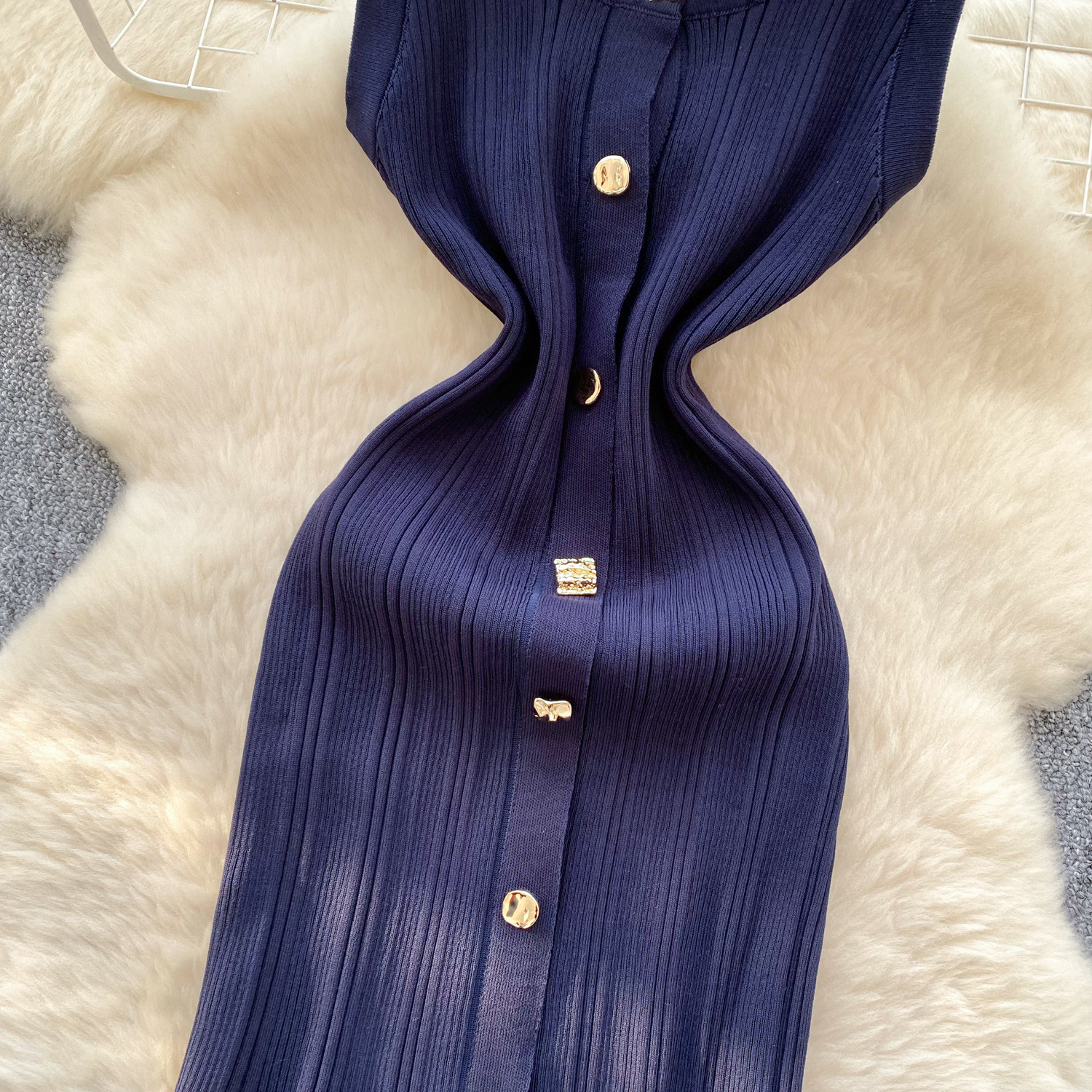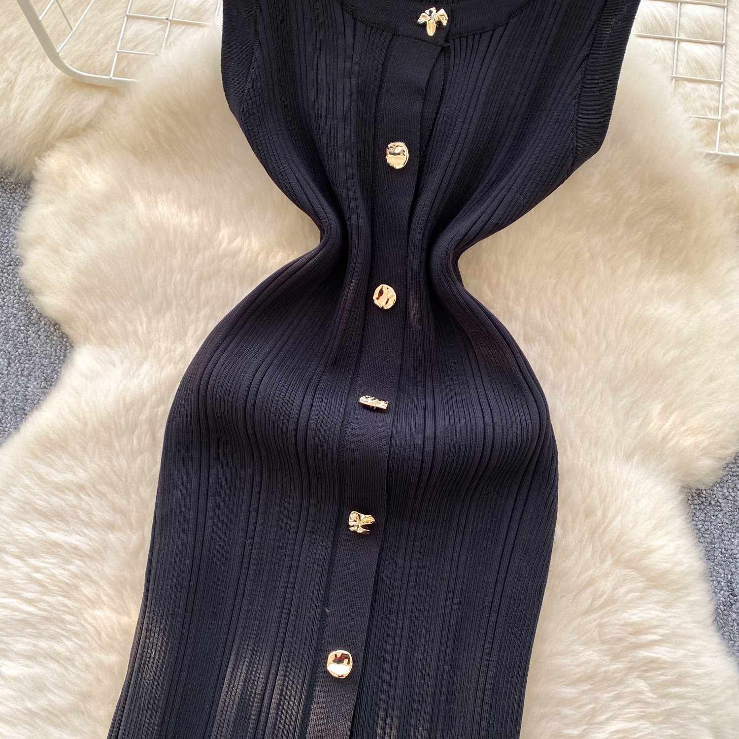 Copy| Product Name | Women's Round Neck Sleeveless Knit Slim Fit Metal Button Tight-Fitting Bodycon Long Dress |