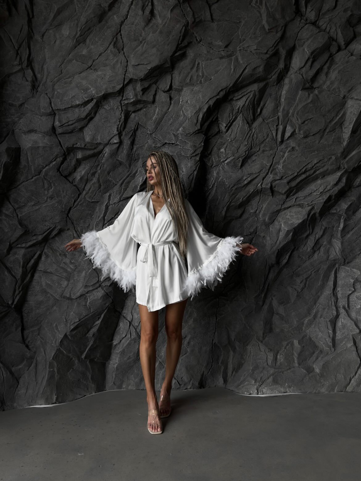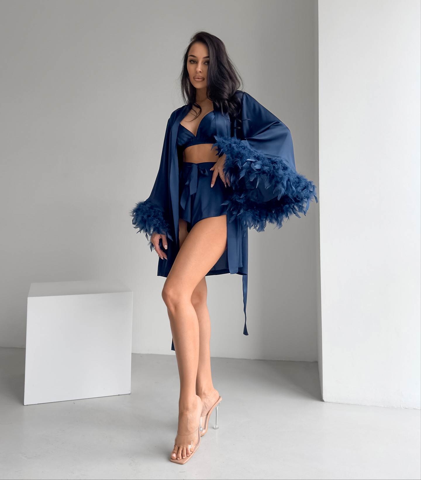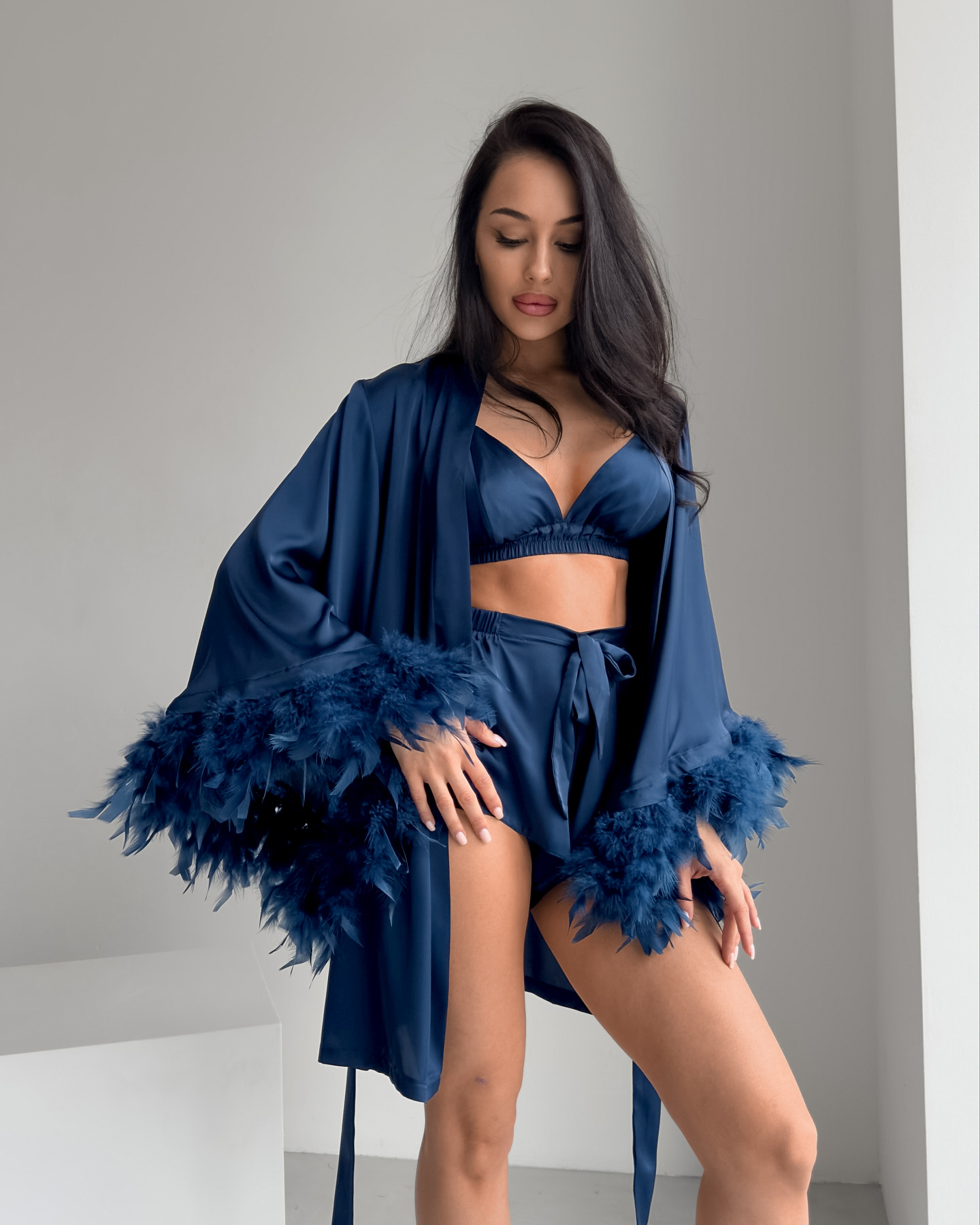 Copy| Product Name | Women's Satin Feather Patchwork Lingerie Shorts Robe Home Three-Piece Seepwear |