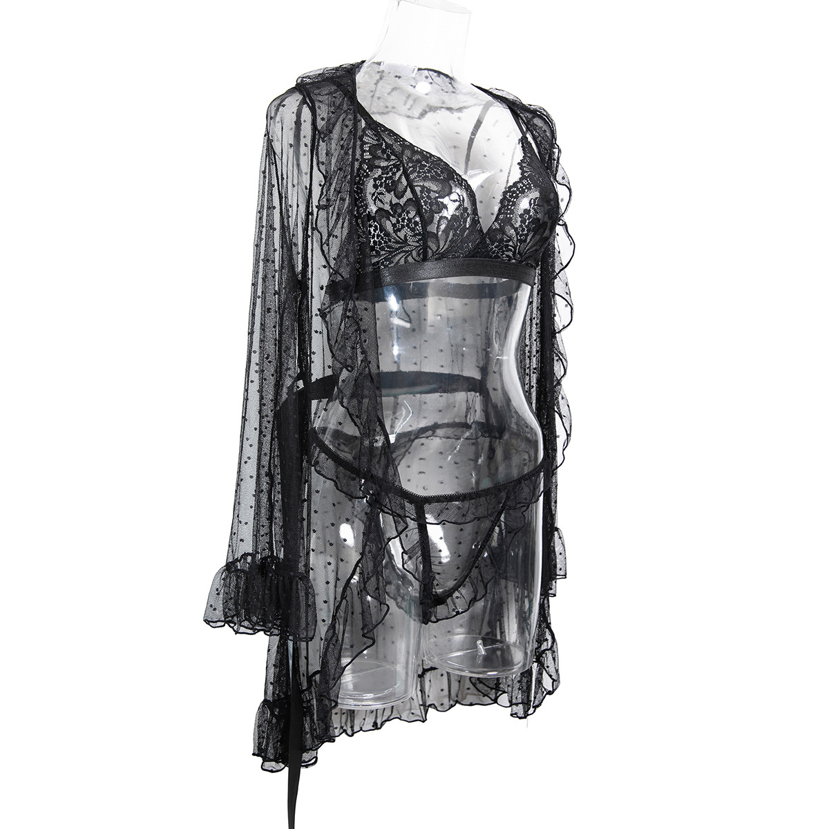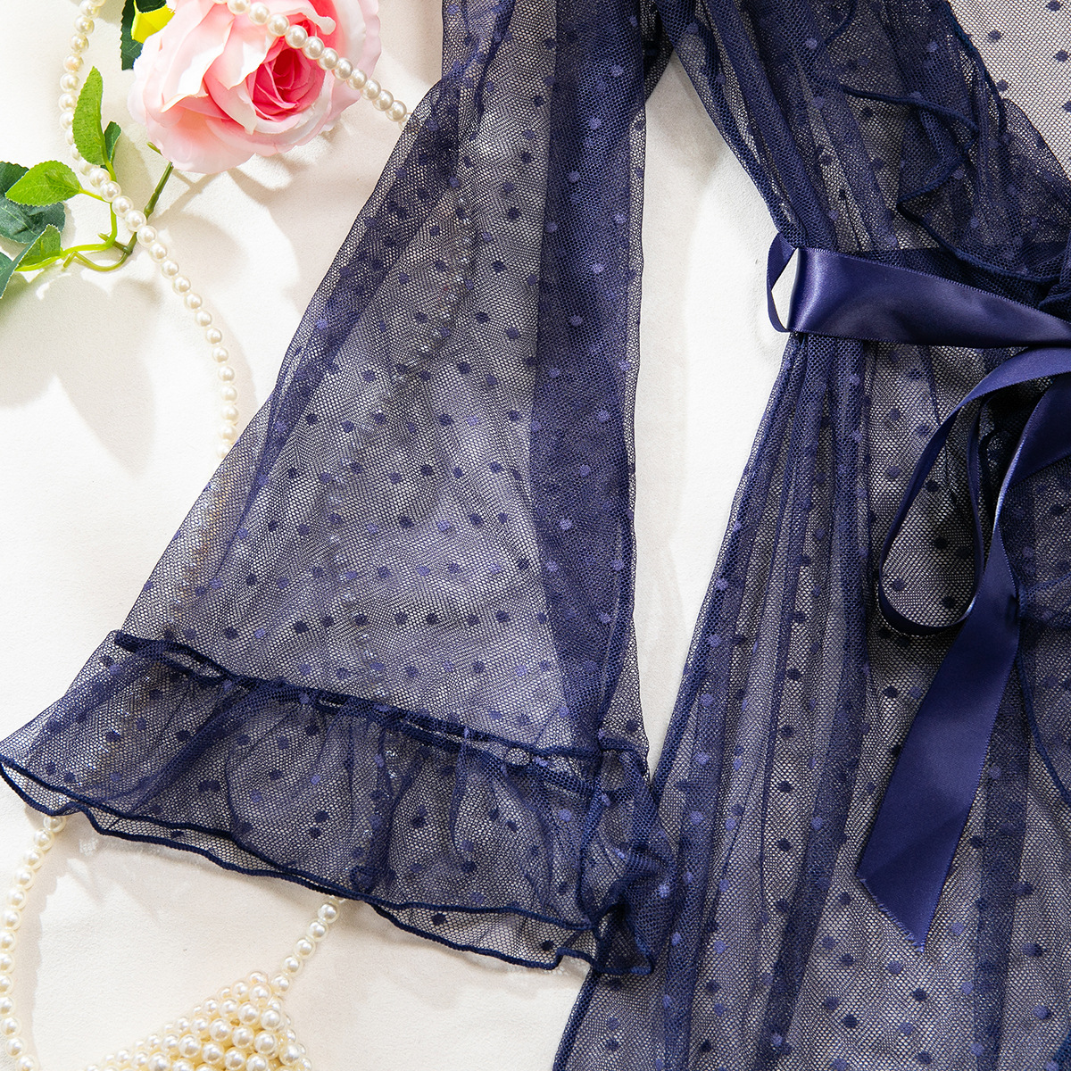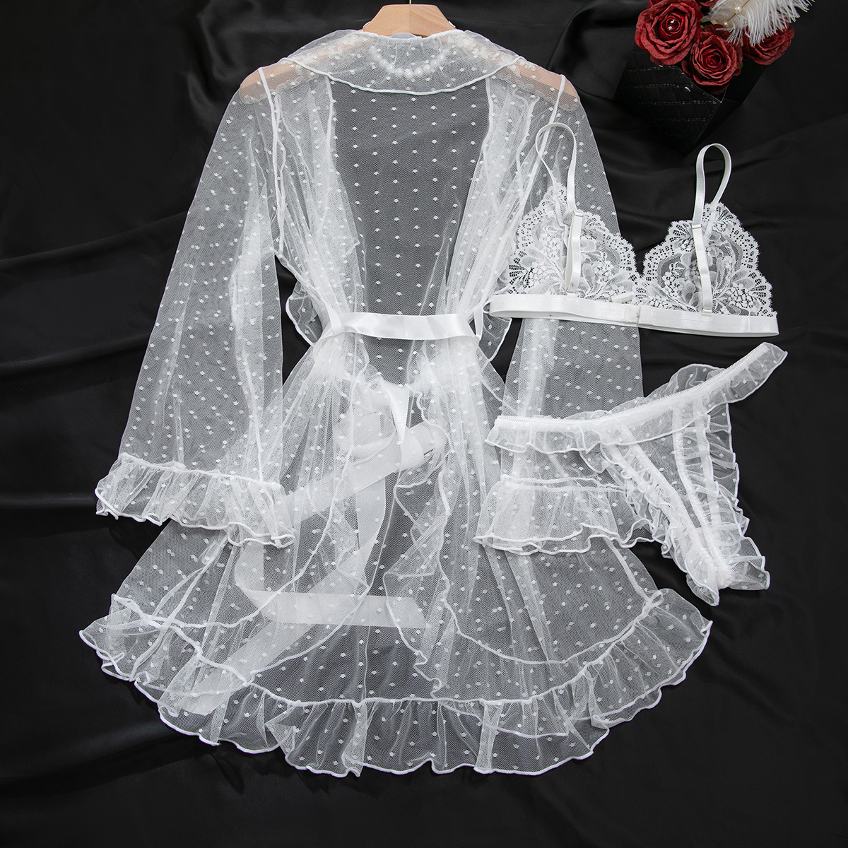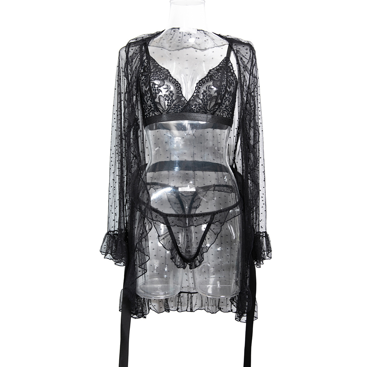 Product Name Women's Sexy Polka Dot See-Through Lace Ruffle Robe Three-Piece Lingerie