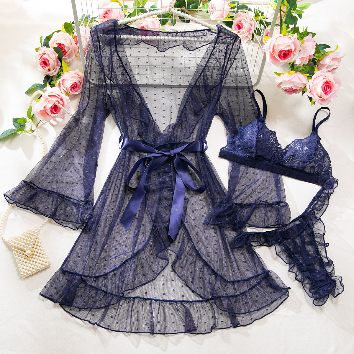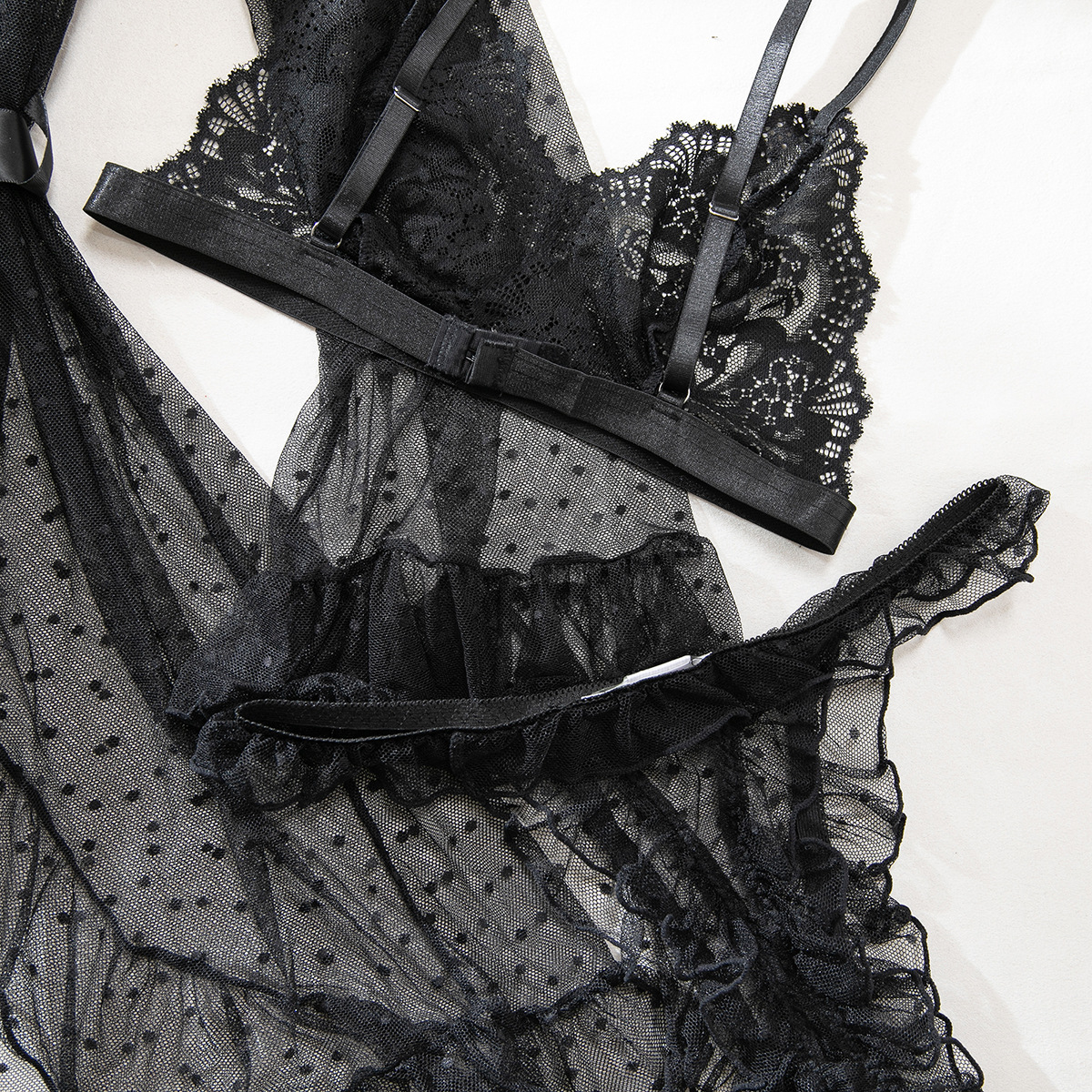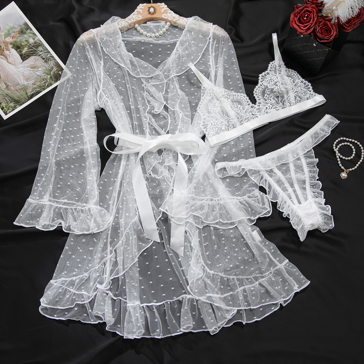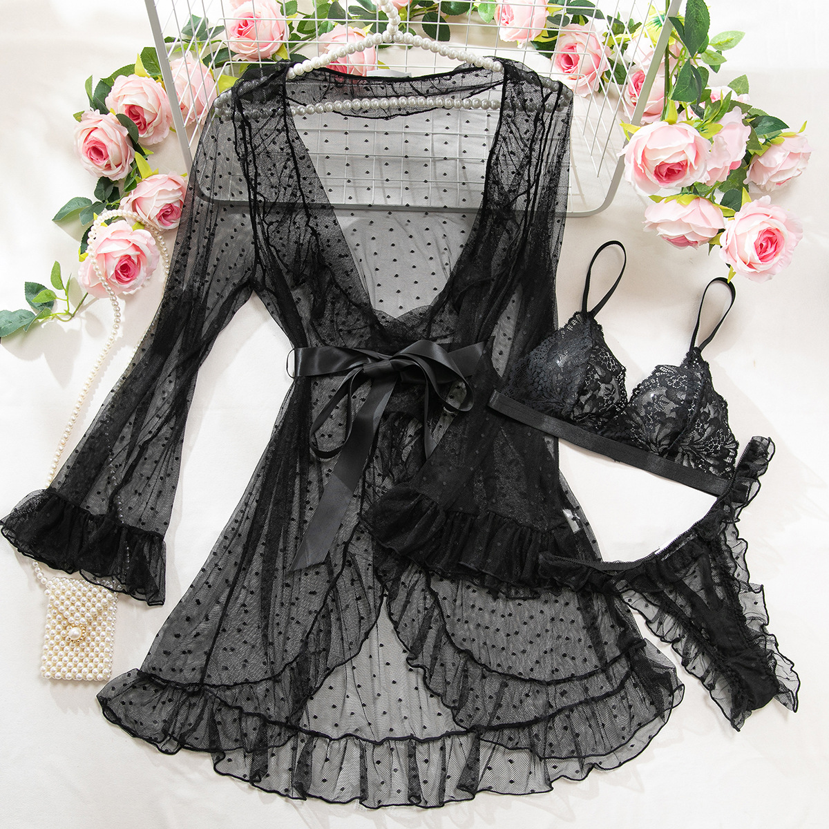 Product Name Women's Sexy Polka Dot See-Through Lace Ruffle Robe Three-Piece Lingerie