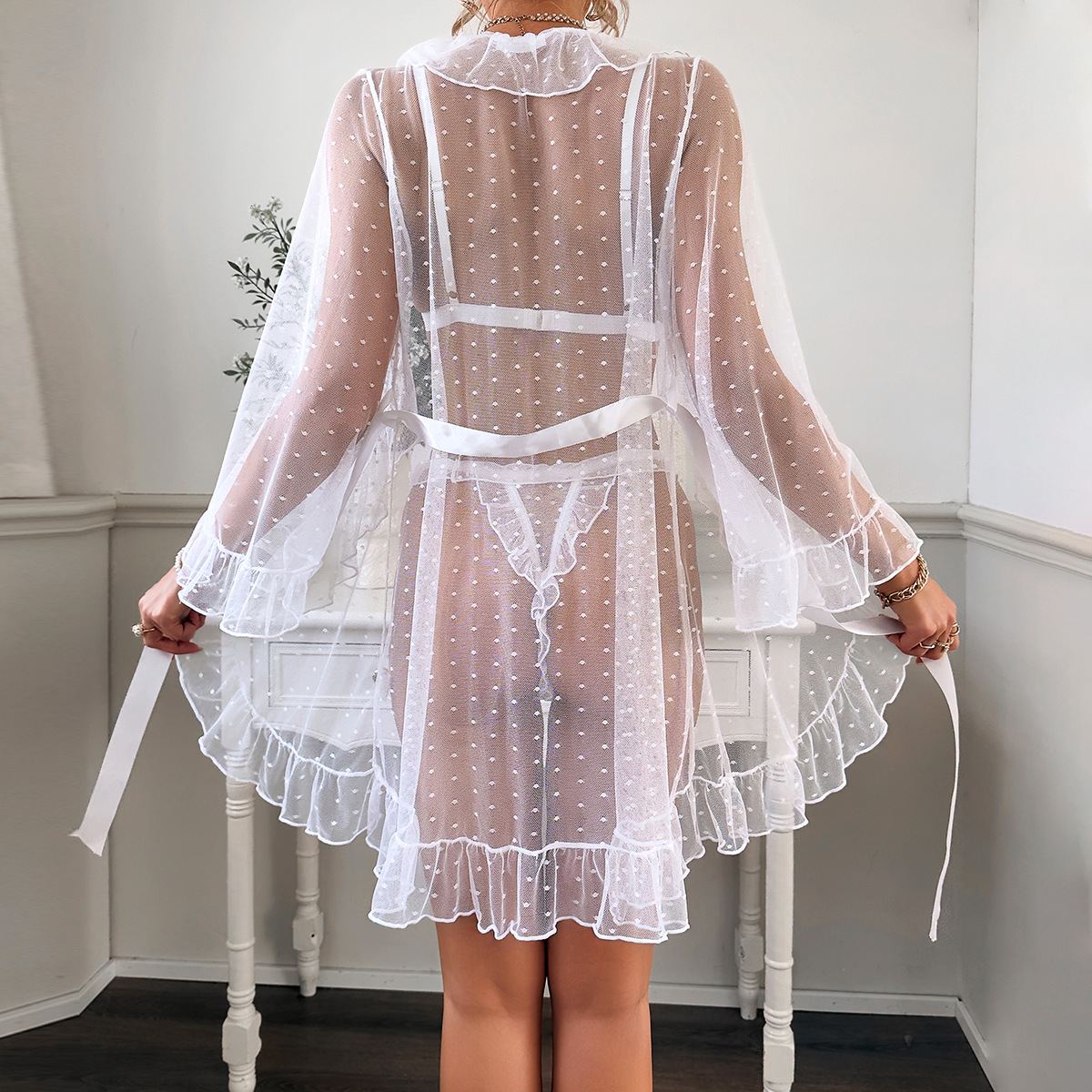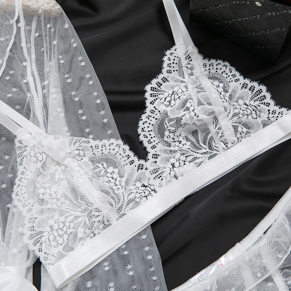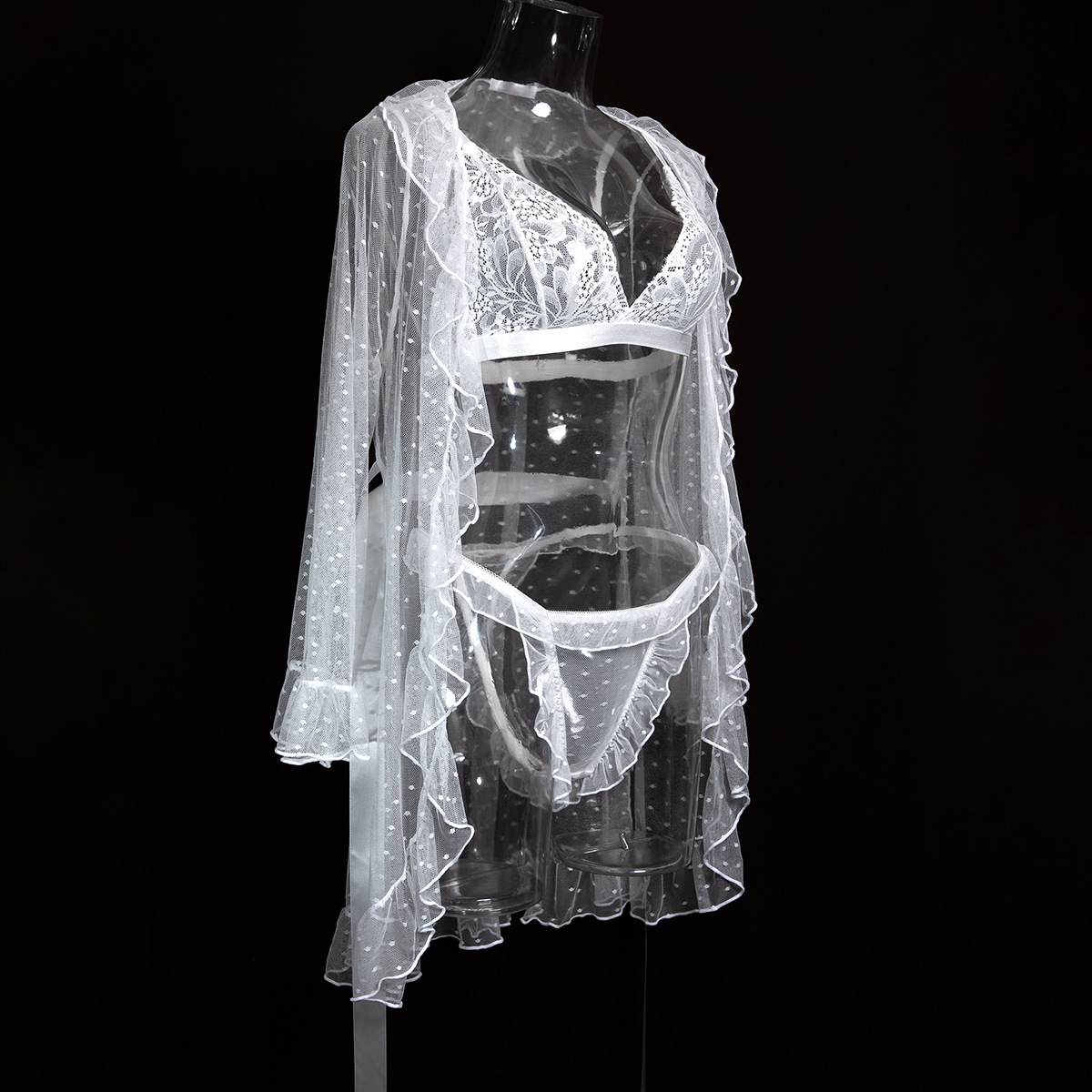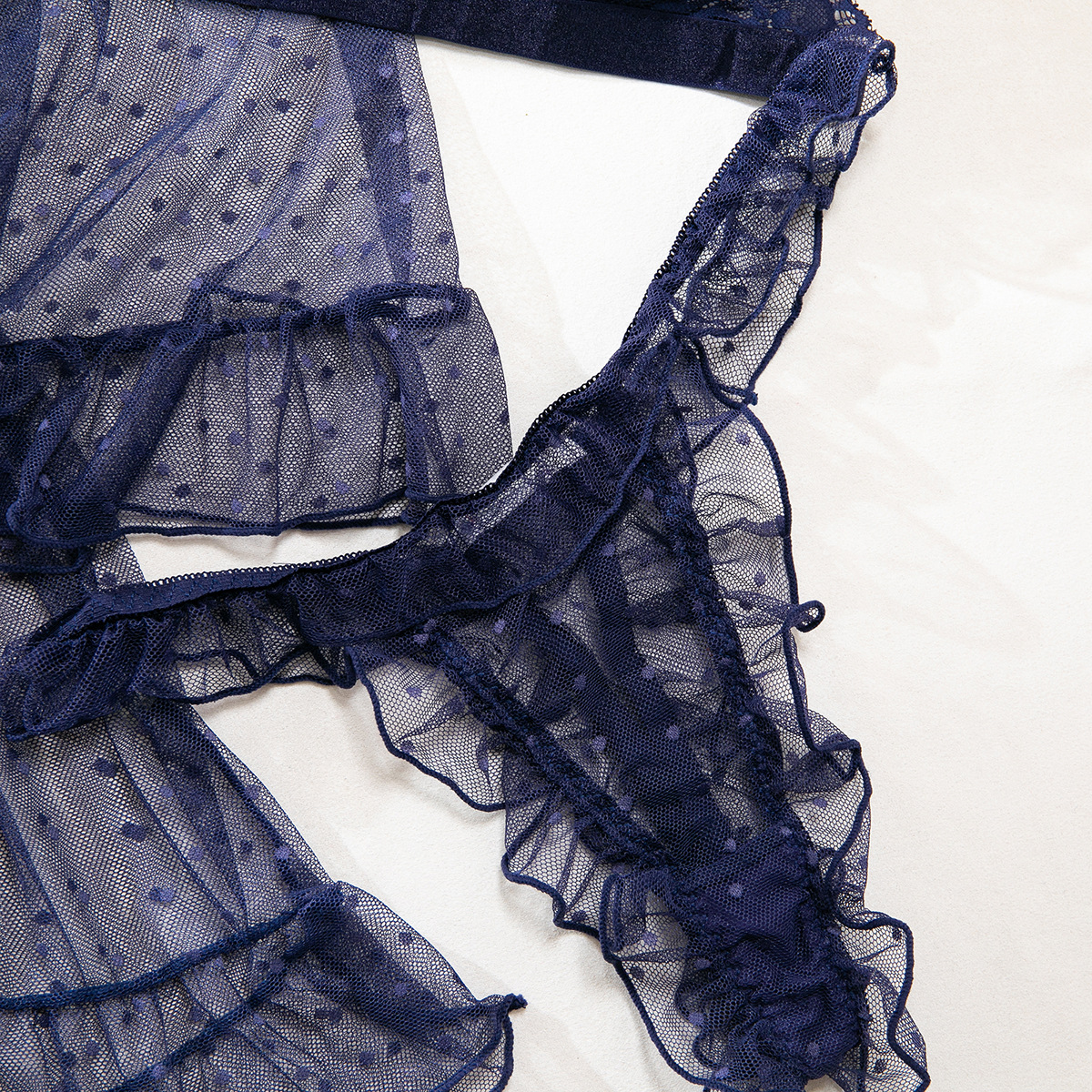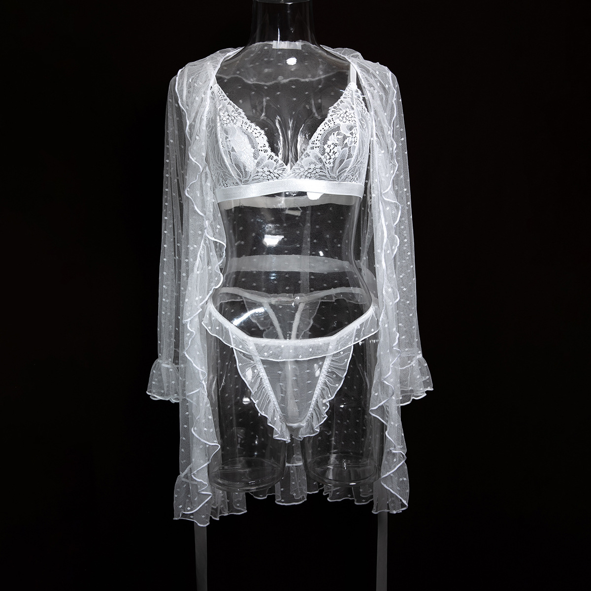 Product Name Women's Sexy Polka Dot See-Through Lace Ruffle Robe Three-Piece Lingerie