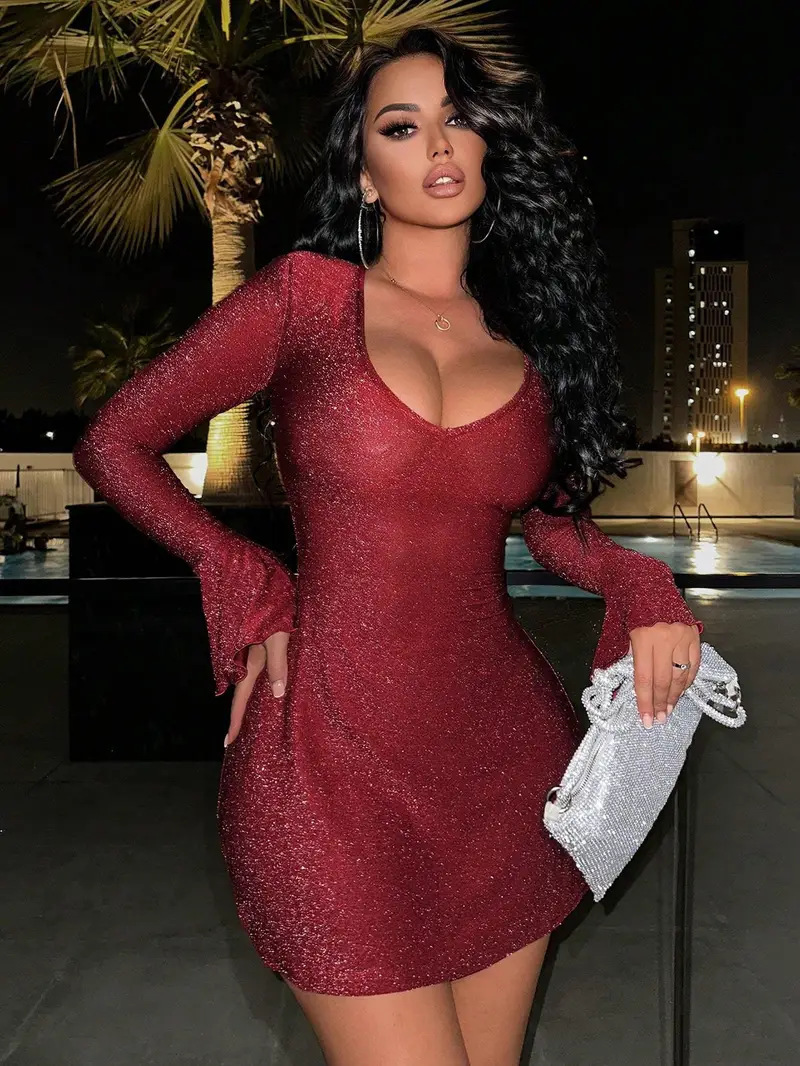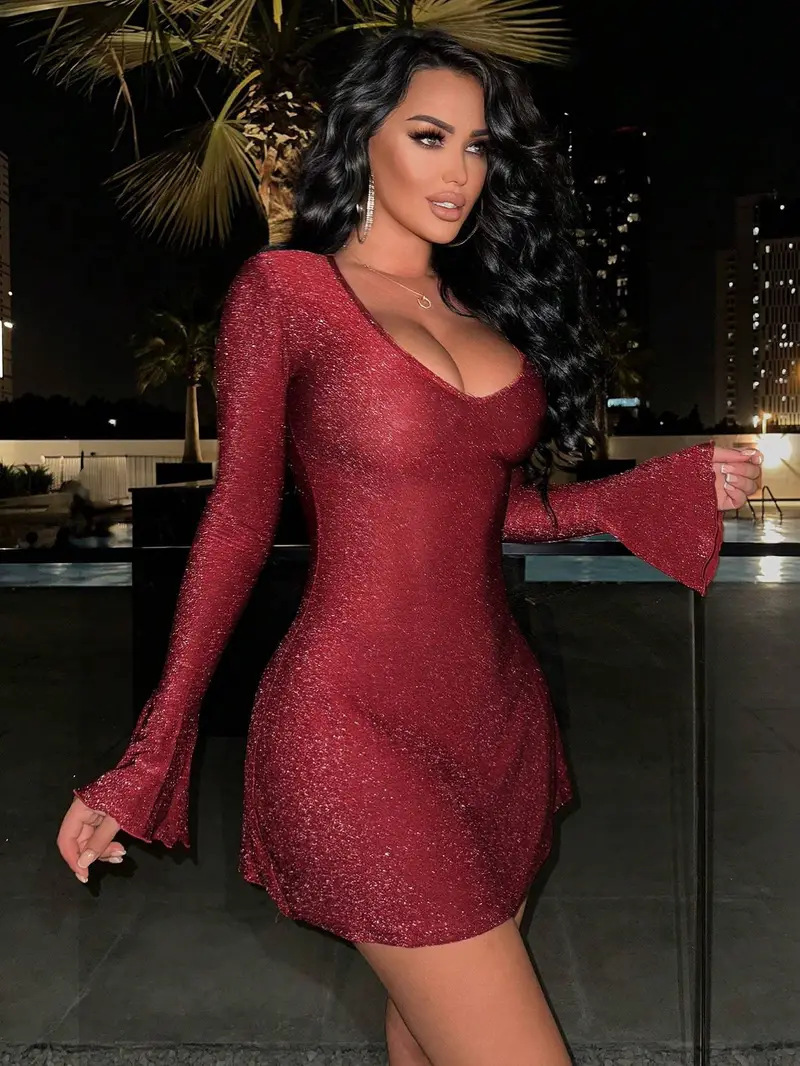 Copy| Product Name | Women's Shiny Silver Long Sleeve Tight-Fitting Mini Party Dress |