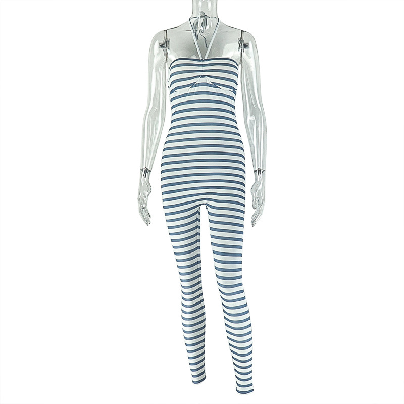 Copy| Product Name | Women's Stripe Print Halter Neck Sexy Low Back Sport Jumpsuit |