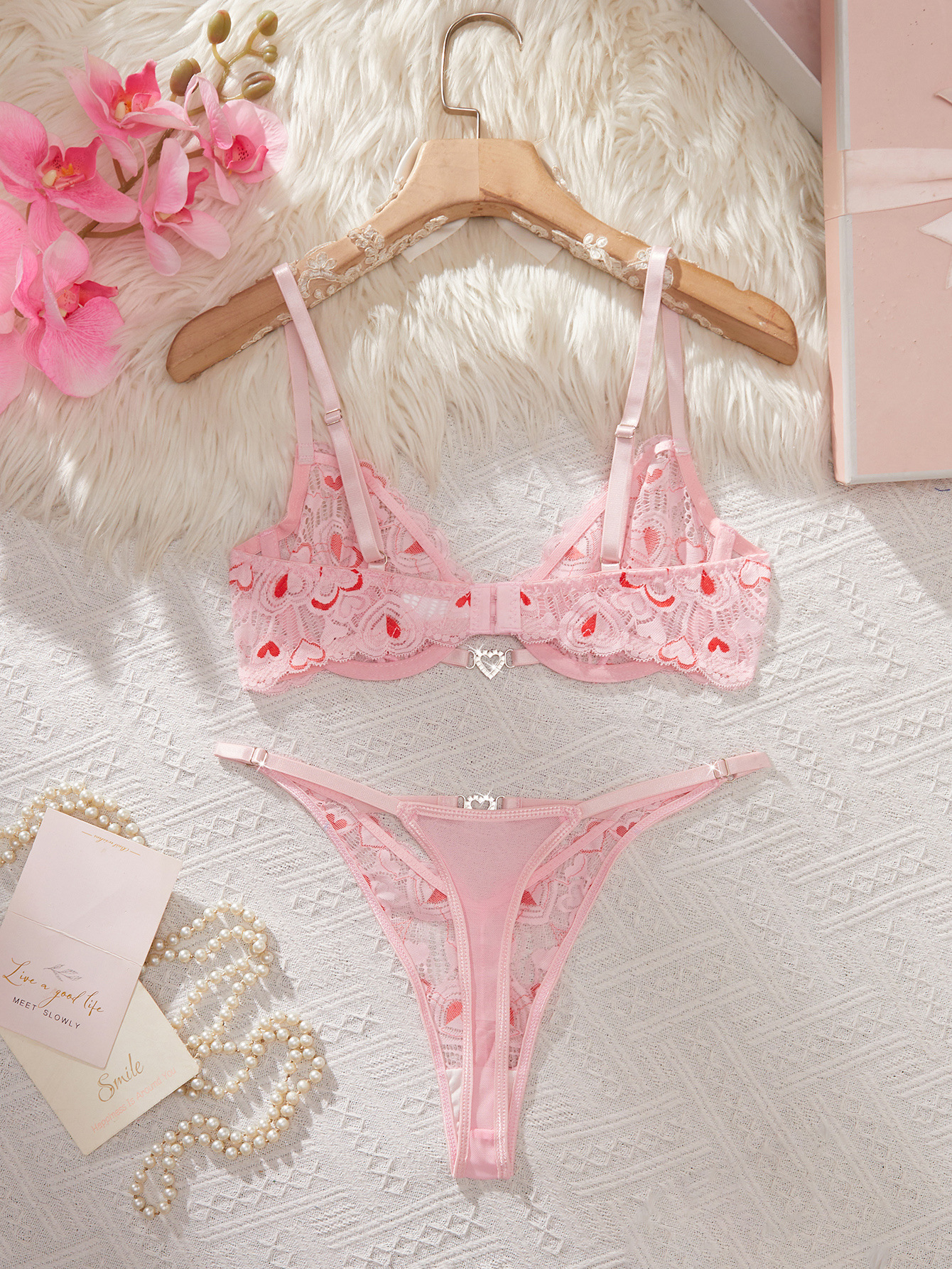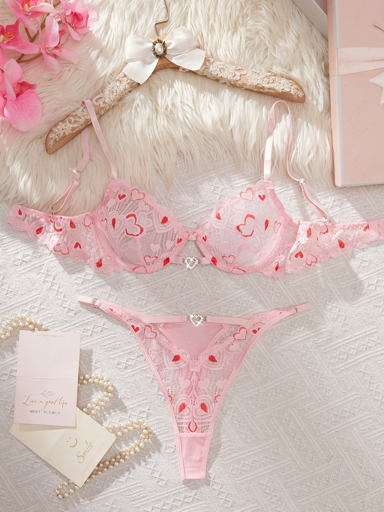 Copy| Product Name | Women's Valentine Heart Print Lace Underwire Push-Up Bikini Lingerie Set |